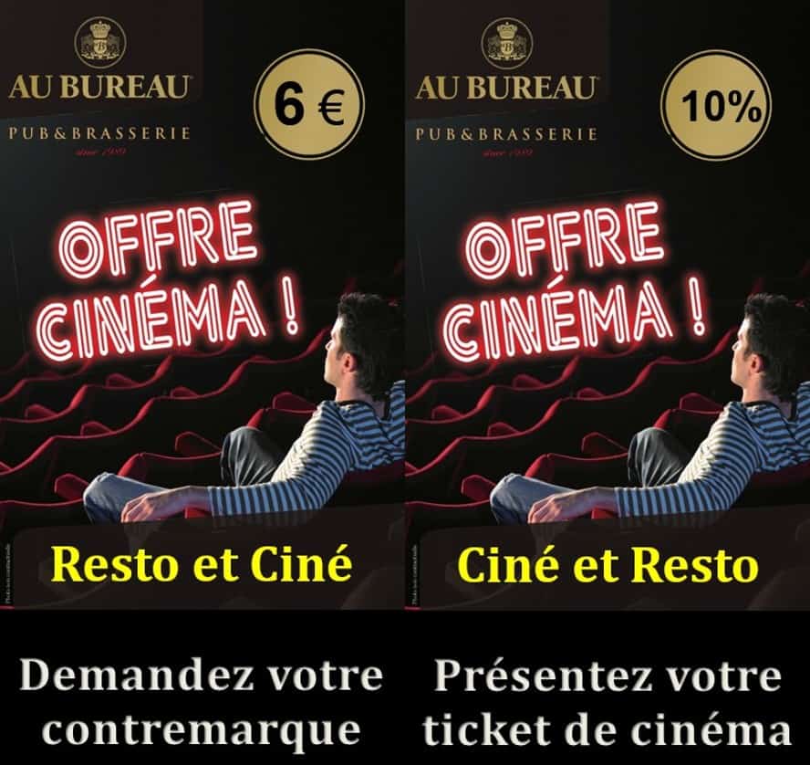 -10% (*) sur Plat + Dessert : Présentez au cours de votre paiement de l'addition votre ticket de cinéma du jour.